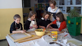 In a bowl mix the sugar with the butter. Add eggs and stir well with a wire rod. Add the almonds and stir.